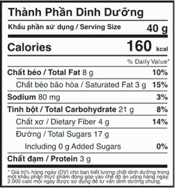→ Chứa hạt điều, hạt bí, đậu phộng, cacao – những người dị ứng cần lưu ý.
